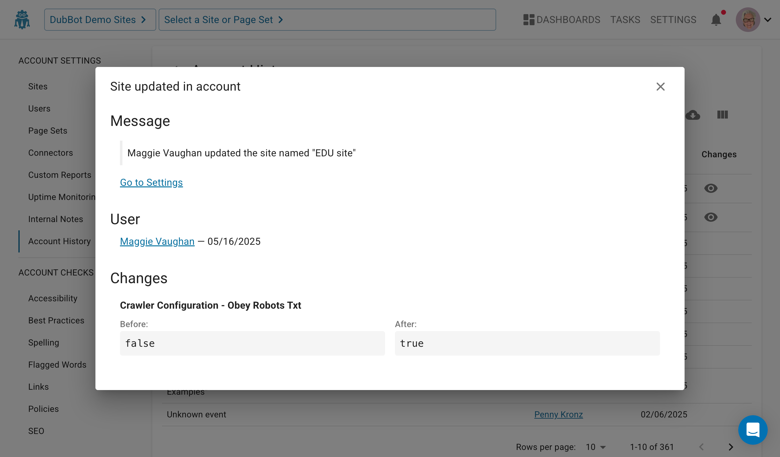 Imagine how excited we were to see this post from one of our engineers in the DubBot #productupdate channel: "Show Site changes in Account History—It's awesome!"