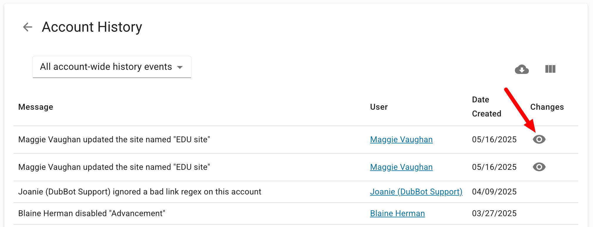 DubBot instantly records any changes to your site. In the Changes column, you will see an icon in the shape of a human eye.