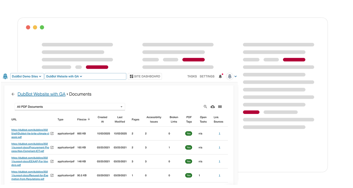 DubBot will flag PDFs missing proper metadata, headings, images without alt text, and much more.